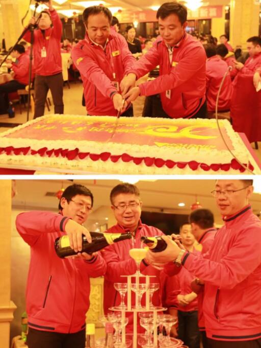 董事長和總經理合力切開20周年慶典蛋糕,總經辦領導一起倒香檳,代表著公司領導階層會繼續同心同力,與金山頂尖共進退同風雨,將晚會推向了高潮。
