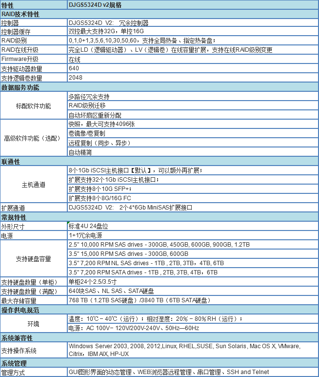 產品定位 DJGS5324D v2統一存儲產品是金山頂尖公司推出的面向數據集中管理、大中型企業的關鍵業務量身定做的模塊化FC/SAS/ SAS / IP-SAN/NAS存儲產品,具有高擴展、高性能、高可靠性和高性價比。融合當前先進的FC、iSCSI存儲標準和技術,專業的企業級磁盤、全面的存儲管理以及模塊化結構為用戶快速、簡便和動態響應不斷變化的容量和性能要求提供了前所未有的靈活性。為用戶提供企業級的存儲,該產品以卓越的品質、性能、經濟可行的價格、專業到位的一站式服務和廣泛的應用領域,為用戶提供一個高可靠性和高數據容錯的磁盤陣列系統 |