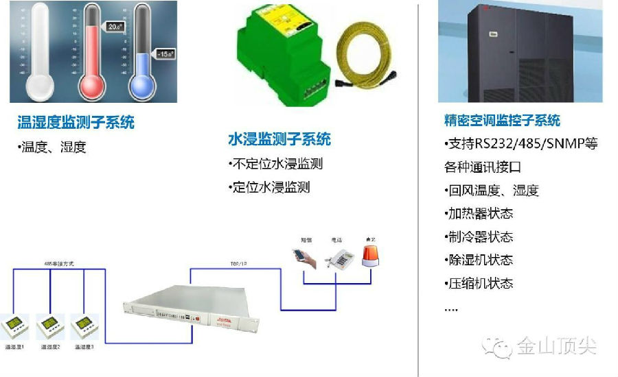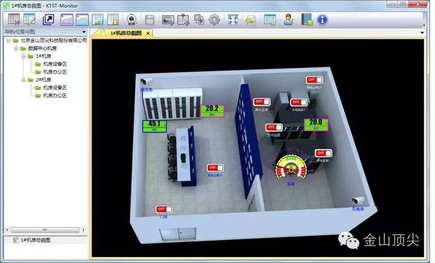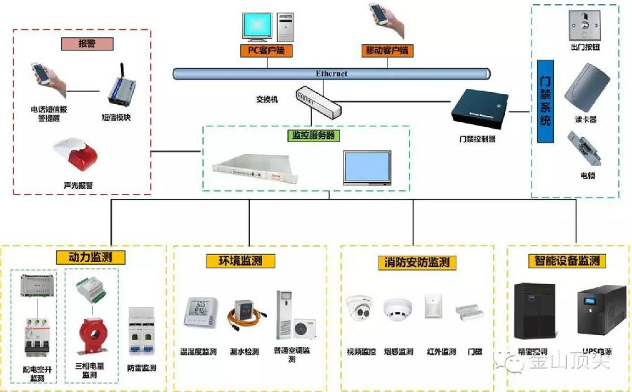 金山頂尖機房預知性維護系統,是基于數字化、網絡化、智能化的環境維護系統,由監控系統管理平臺、嵌入式環境監控主機、數據采集模塊、各種傳感器、系統報警設備及前端被監測設備組成。機房內被監測設備、各種傳感器、報警設備直接與監控主機相接。安裝方便,大大減少了由中間協議轉換設備故障、多串口卡故障、操作系統故障所帶來的數據采集中斷,造成整個監控系統癱瘓的問題,減少了故障點,提高了系統的穩定性和可靠性,提高了系統效率。